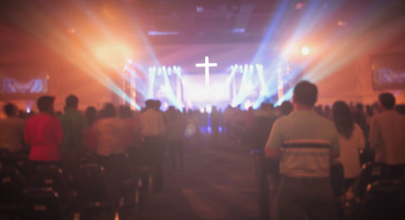 Back view of Christians worship with raised hands in church. Defocused, suitable for background.