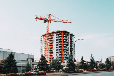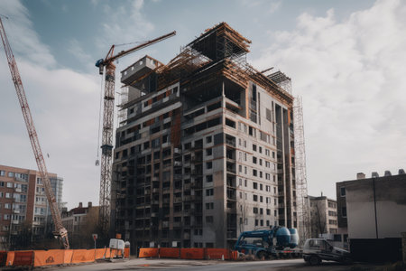 construction site with scaffolding and crane towering over the building, created with generative ai