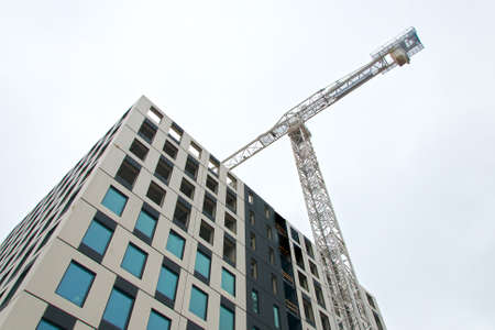 Modern multistory residential building and a lifting crane. Building construction.