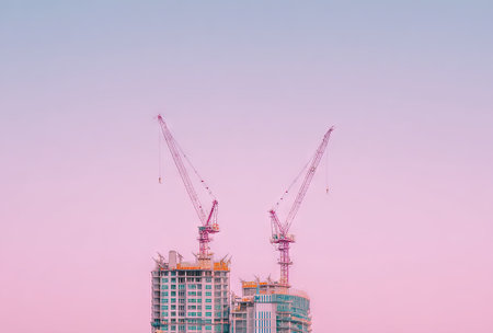Two construction cranes stand atop unfinished buildings under a gradient sky. The visual composition features architectural elements with muted colors. The scene suggests an urban environment, potentially at sunset or sunrise. Suitable for commercial projects or editorial use.