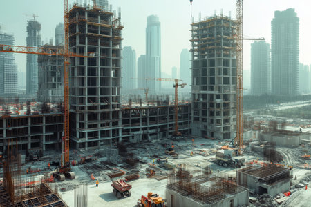 Detailed hdr photograph of a bustling construction site with high rise developments and equipment
