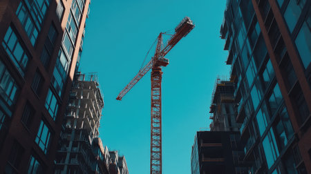 Towering construction crane lifting heavy steel beams against a clear blue sky, framed by modern urban architecture