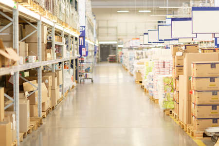 Saint Petersburg, Russia - January 25, 2018: Warehouse storage on racks of building materials for retail sale in a specialized store. Pallets with packed items.