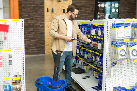 Handsome man in his 20 buying a new switch at the hardware store while doing a home improvement project