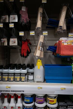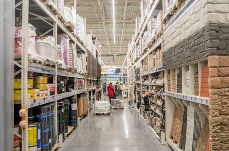 Large selection of building materials are sold in a hardware store. Goods for construction and repair. Minsk, Belarus - april, 2022