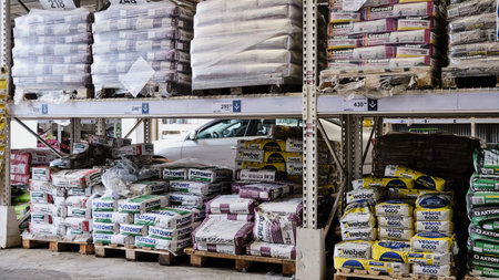 MINSK, BELARUS - May 16, 2020: Building materials are sold in a hardware store. Bags of cement, plaster and other goods for construction and repair are stacked on pallets.