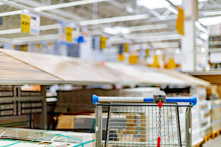 The trolley cart shopping the decorate funiture for interior inside the house in the big warehouse store.