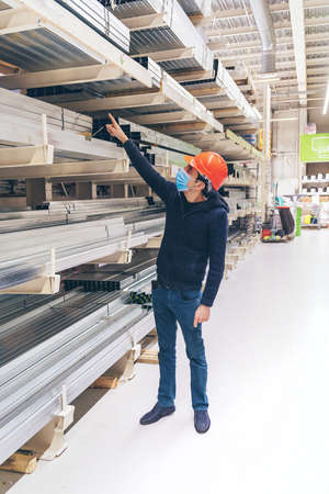 A man in a hardware store. Sells metal profiles for drywall. Selective focus. People.