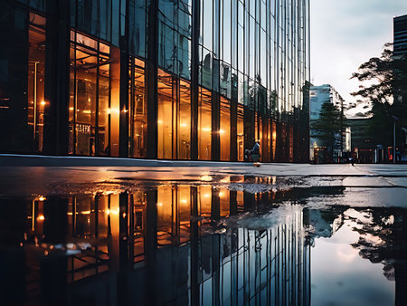 A stunning image of a modern office building reflected in a puddle during sunset, capturing the essence of a bustling urban skyline at night.