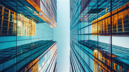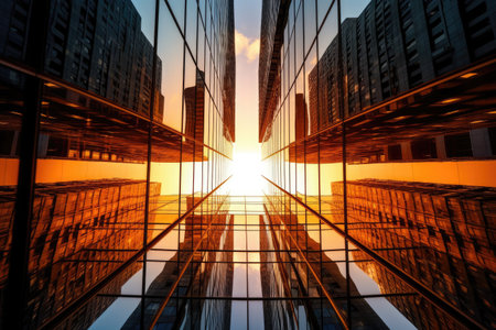 An urban scene features high-rise buildings mirrored in a glass facade at sunset. The composition showcases the cityscape's skyline, with golden hues from the setting sun. The image may be suitable for commercial applications related to architecture, real estate, and urban development.