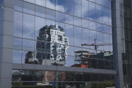 Modern skyscrapers with glass mirror walls. Business center, mirror reflection of high-rise buildings.