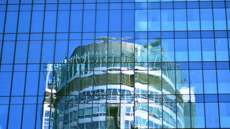 Background of future urban and corporate architecture. Real estate idea with bokeh, motion blur, and a reflection in a glass panel of a skyscraper facade