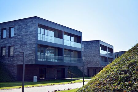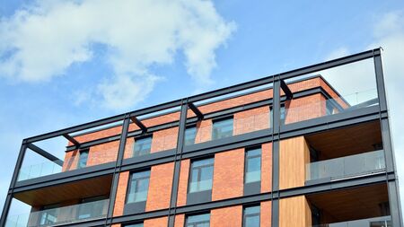 Contemporary residential building exterior in the daylight. Modern apartment buildings on a sunny day with a blue sky. Facade of a modern apartment building