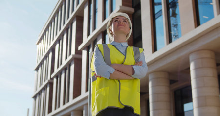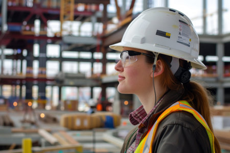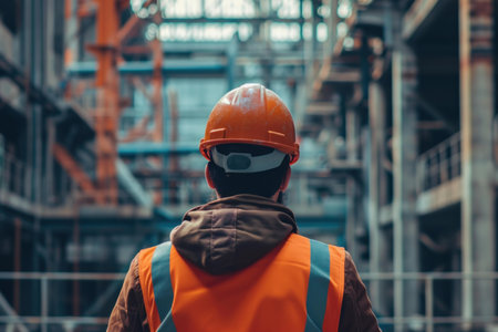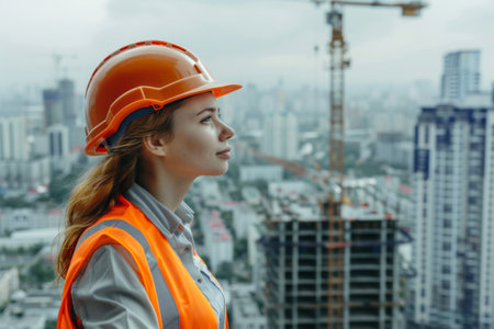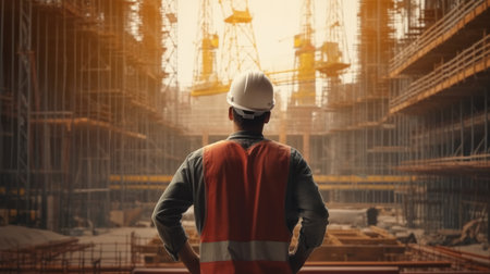 A vigilant construction professional in a bright safety gear surveys ongoing development amid towering cranes and modern cityscape silhouettes, capturing urban growth ene