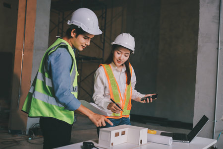 Asian man worker. Team Civil Engineer and Contractor discussion in construction site. Team Architect working use BIM technology and digital construction application on digital tablet.