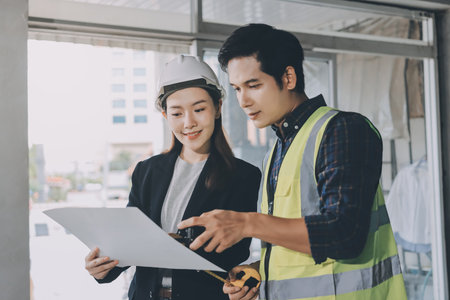 multi ethnic engineer brainstorming and measuring for cost estimating on blueprint and floor plan drawings about design architectural and engineering for houses and buildings.