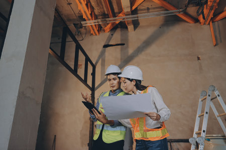 Team Civil Engineer and Contractor discussion in construction site. Team Architect working use BIM technology and digital construction application on digital tablet. Asian man worker.
