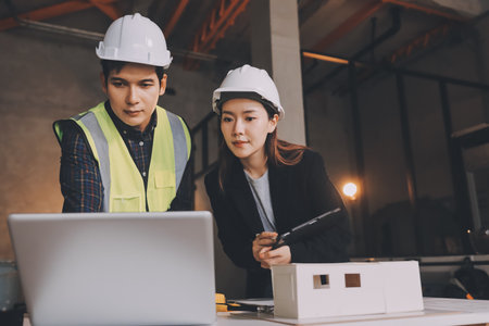 Architect and Builder with computer laptop discussion planning on progress together. Team Civil Engineer and Contractor working with tablet at construction site.