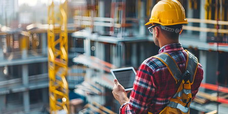 Construction Worker in Safety Gear Using Tablet to Manage Project Details in Modern Building