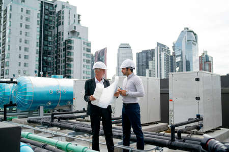 Young engineer man use walkie talkie to contact with his team and stand beside senior coworker who hold building plan or drawing and they stand on rooftop of construction site.