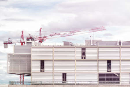 Modern multistory residential buildings under construction. Evening scene with buildings and lifting cranes.