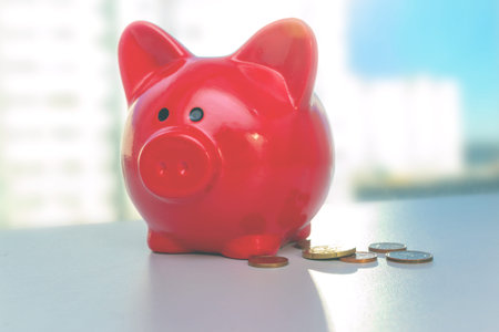 A red piggy bank stands on the table near the window, near it is a pile of small euro coins. Bright light background of city houses