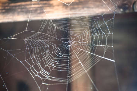 Closeup of spider nest on wooden stairs outdoor, banner, sunny day
