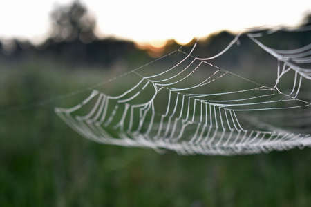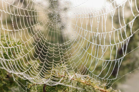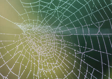 Spider web with dew drops in the morning light. Nature background