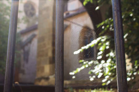 Iron grilled fence and a spider web focused