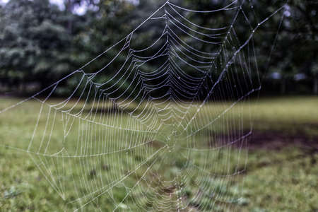 Close up abstract art macro photography of cobweb or spiderweb with rain or dew water drops in the morning fog. Natural abstract background.
