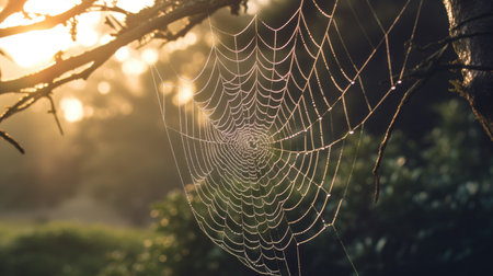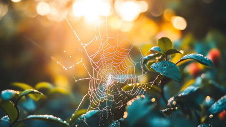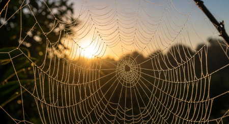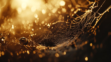 A stunning close-up shot of a spiderweb glistening with morning dew. The intricate details and delicate beauty of nature are captured in this image.