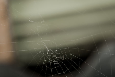 Spiderweb with light green bokeh background. Cobweb with glue droplets.