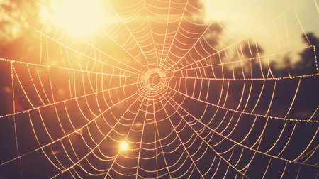 Spider web with dew drops at sunrise, close-up.