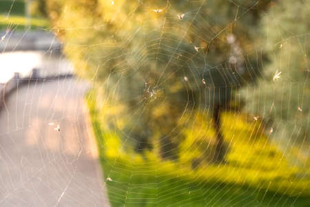 Close up of the spider web or cob web with midges and flies on a warm background of autumn sunset