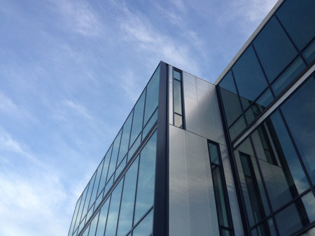 Modern curtain wall made of glass and steel. Blue sky and clouds reflected in windows of modern office building.