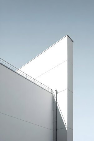 A striking capture of a modern architectural corner showcasing sleek lines and geometric precision set against a clear blue sky, embodying contemporary design aesthetics.