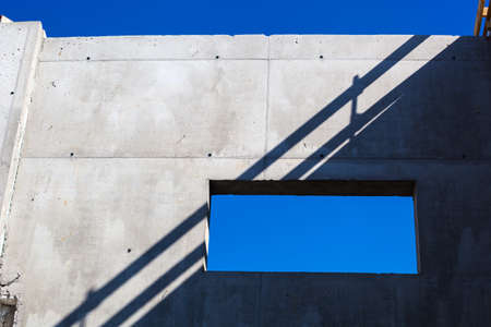 A close-up view of a construction site showcasing unfinished concrete walls, frames for windows, and scaffolding, emphasizing urban development and modern architectural trends.