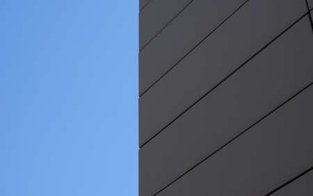 A view at a straight facade of a modern building with a dark gray facade. Dark gray metallic panel facad. Modern architectural details.