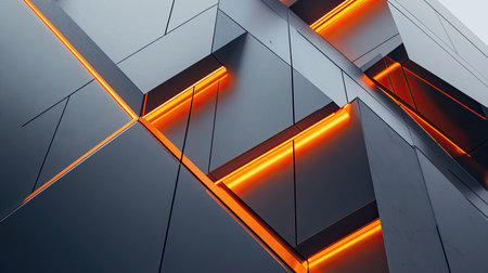 Architectural detail of overlapping gray and orange planes, angular corners, and glossy surfaces reflecting soft light for an abstract texture