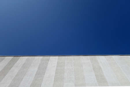 Part of white building against blue sky. Abstract architectural design with strong geometry lines. Urban design with minimalist concrete architecture