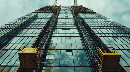Construction Lifts on Building Facade, Ideal for companies specializing in building restoration and renovation. The background can depict construction lifts ascending along the facade of a building.