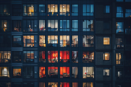 Close-up of a modern building's exterior with illuminated windows at dusk