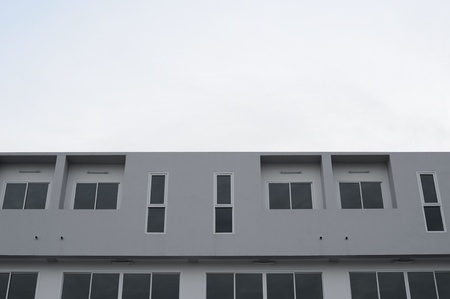 Modern European building. White building with many windows against the blue sky. Abstract architecture, fragment of modern urban geometry.