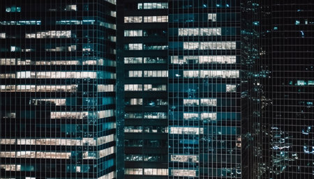 A view of skyscrapers in a city at night, the windows are illuminated, creating a bright and vibrant contrast against the dark sky.