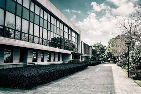 Curtain wall made of toned glass and steel constructions under sky. A fragment of a building. Black and white.