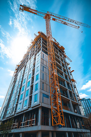 A detailed view of an urban construction site featuring a crane and scaffolding. This image highlights the modern architecture and ongoing development in a city environment.