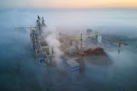 Aerial view of cement factory with high concrete plant structure and tower crane at industrial production site on foggy morning. Manufacture and global industry concept