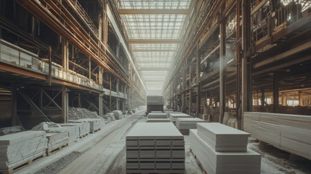 A long, industrial warehouse interior with machinery, metal structures, and bright lighting