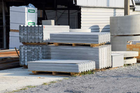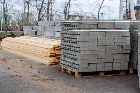 Concrete blocks are stacked in even rows, a warehouse of building materials in the open air, boards lie in a heap on the ground, flat bricks for building a house. high quality photo