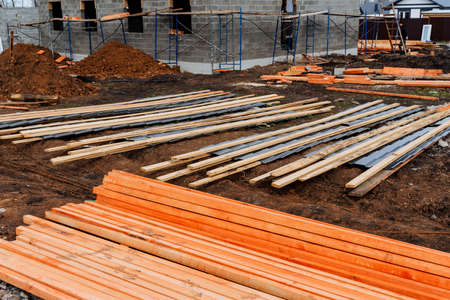 Construction of a country house, a construction site on the ground, board materials for the house, a protective coating of wood from rot. high quality photo